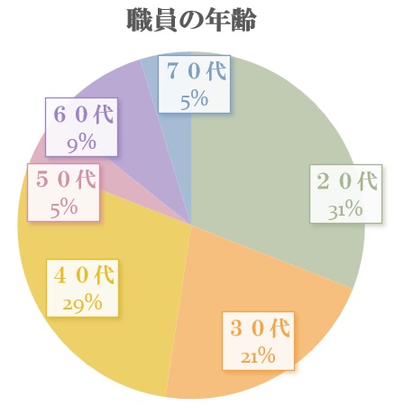 性別の偏りもなく、幅広い年齢層の職員が在籍していますので、